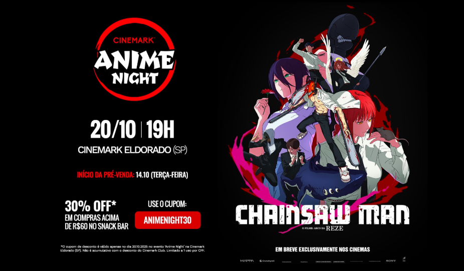 Pela primeira vez a série de anime Chainsaw Man ganhará um filme para chamar de seu e a produção está chegando às telonas brasileiras. Para este momento especial, a Cinemark preparou mais uma edição da Anime Night, evento exclusivo da Rede para fãs das produções japonesas. Esta nova edição acontece no dia 20 de outubro, na Cinemark Eldorado, a partir das 19h, três dias antes da estreia oficial do longa ‘Chainsaw Man: O Filme – Arco da Reze’. A pré-venda de ingressos está disponível no site e no app da Cinemark. Membros Cinemark Club podem resgatar seus ingressos para conferirem esta edição do Anime Night Cinemark.