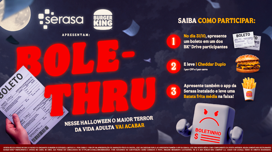 Neste Halloween, o Burger King® e a Serasa se unem para combater um dos maiores terrores da vida adulta: o boleto. Em uma campanha que mistura o humor característico do BK® com o propósito de educação financeira da Serasa, as marcas apresentam o “Boleto Thru”: uma ação inédita que transforma as contas do dia a dia em um sanduíche na faixa.