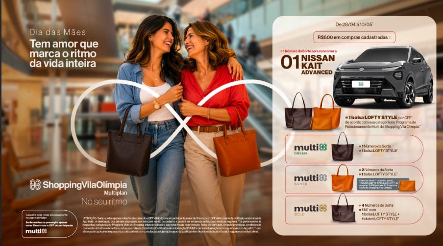 O Dia das Mães ganha uma promoção especial no Shopping Vila Olímpia, convidando os clientes a celebrarem a data com estilo e benefícios exclusivos. Entre 28 de abril e 10 de maio, com R$ 600 em compras, os consumidores levam para casa uma bolsa LOFTY STYLE e um número da sorte para concorrer ao sorteio de um NISSAN KAIT Advance.