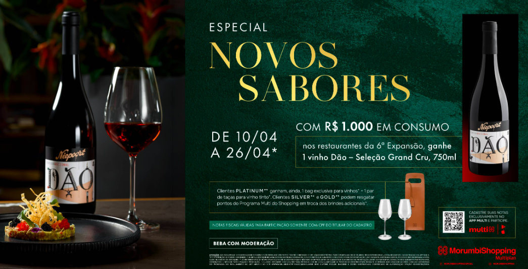 A ação convida o público a explorar os novos restaurantes do empreendimento em uma experiência que vai além da gastronomia. No formato “compre e ganhe”com R$1.000 em consumação nos restaurantes participantes da 6ª expansão, os clientes recebem um vinho do Dão (750ml), selecionado pela Grand Cru, referência em curadoria de rótulos.