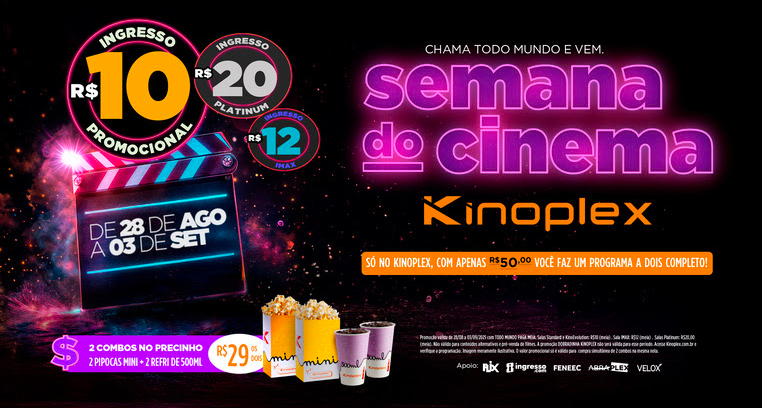 No Kinoplex, a ação acontece de 28 de agosto a 03 de setembro, trazendo ingressos por apenas R$ 10 para salas standard e Kinoevolution, R$20,00 para salas Platinum (VIP) e R$12,00 para sala IMAX. Além dos ingressos promocionais, o Kinoplex também desenhou uma promoção de bomboniere, para que permitir que duplas de cinéfilos consigam fazer um programa completo com R$50,00. Na promoção Kinoplex, ao comprar 2 combos mini, com 2 sacos de pipoca mini e 2 refrigerantes de 500ml, o cliente vai pagar apenas R$30,00 nos dois combos. Ou seja, 2 ingressos para salas standard ou Kinoevolution + 2 combos Mini somam R$49,00.