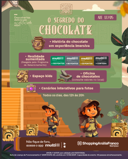 O Shopping Anália Franco convida o público para uma viagem envolvente pelos mistérios e encantos do chocolate com a experiência imersiva “O Segredo do Chocolate”, que acontece até o dia 17 de maio, na Praça de Eventos. Com proposta lúdica e interativa, a atração transforma o passeio em uma verdadeira imersão sensorial, unindo conhecimento, tecnologia e diversão para todas as idades.