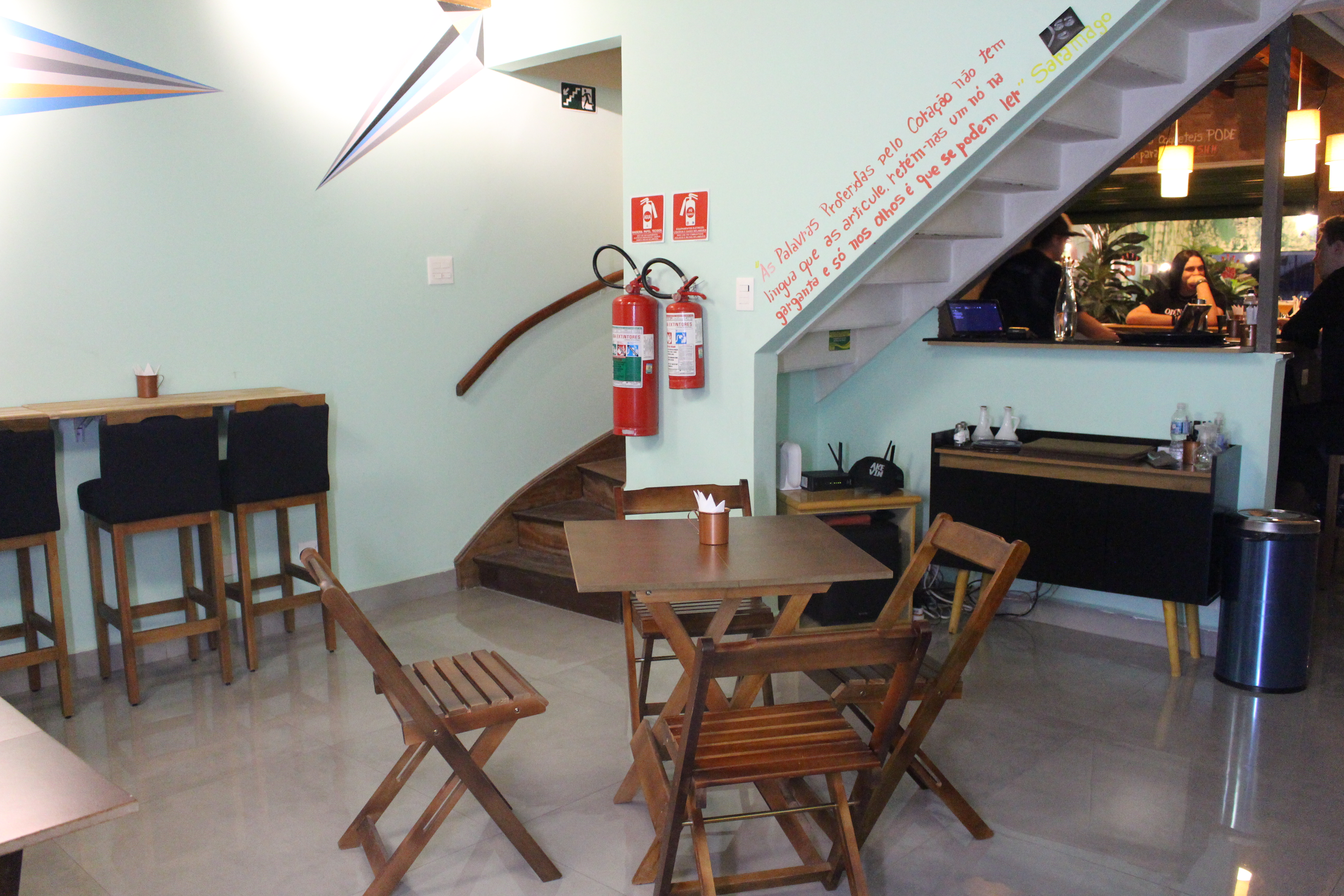 Lá no fundo, algumas mesas mais reservadas. Subindo as escadas, existe outro ambiente aberto ao público — descolado, artístico, perfeito pra quem gosta de conversar, beber e ficar mais isolado do movimento.