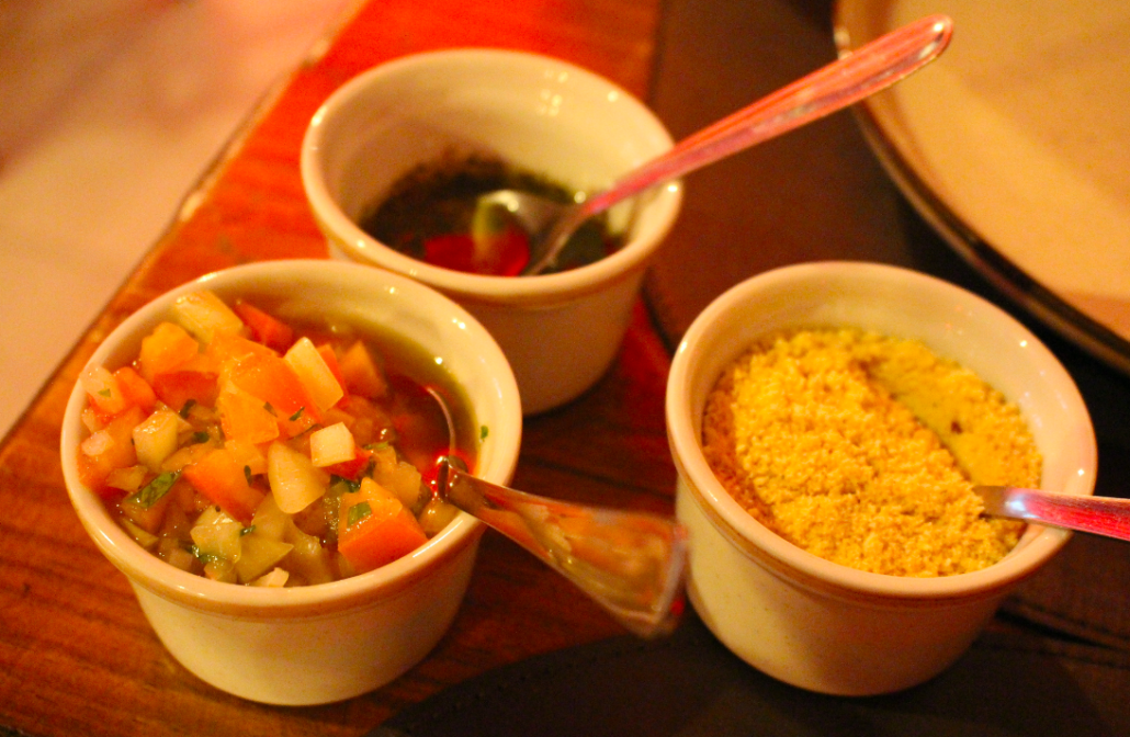 Os acompanhamentos sustentam o protagonismo sem roubar a cena. O vinagrete de cebola roxa traz acidez que limpa o paladar e equilibra a gordura do corte. A farofa de banana com castanha entrega contraste entre doce e crocante, enriquecendo a textura do prato. O chimichurri intensifica os sabores com ervas frescas e acidez na medida.