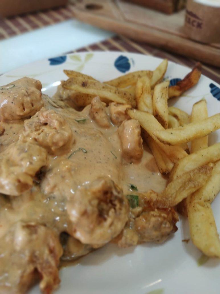 Gente, o tamanho da peça de filet mignon é super generosa, o molho era muito bom e picante e muitos camarões por cima. Os camarões são um show a parte, pois são empanados e extremamente saborosos. Os sabores em si combinam muito, mas são bem intensos. Quem gosta de comida mais leve realmente não vai curtir o prato, mas EU AMEI e com certeza pedirei de novo no restaurante presencialmente.