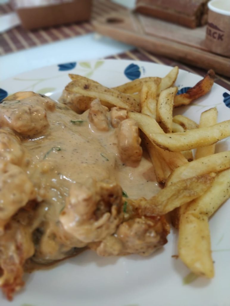 A comida chegou quente, mas assim que coloquei no prato preferi esquentar no micro-ondas antes para não perder todo o sabor do prato e meu acompanhamento foram as batatas fritas, que não estavam muito crocantes por causa do transporte, mas estavam muito boas também.
