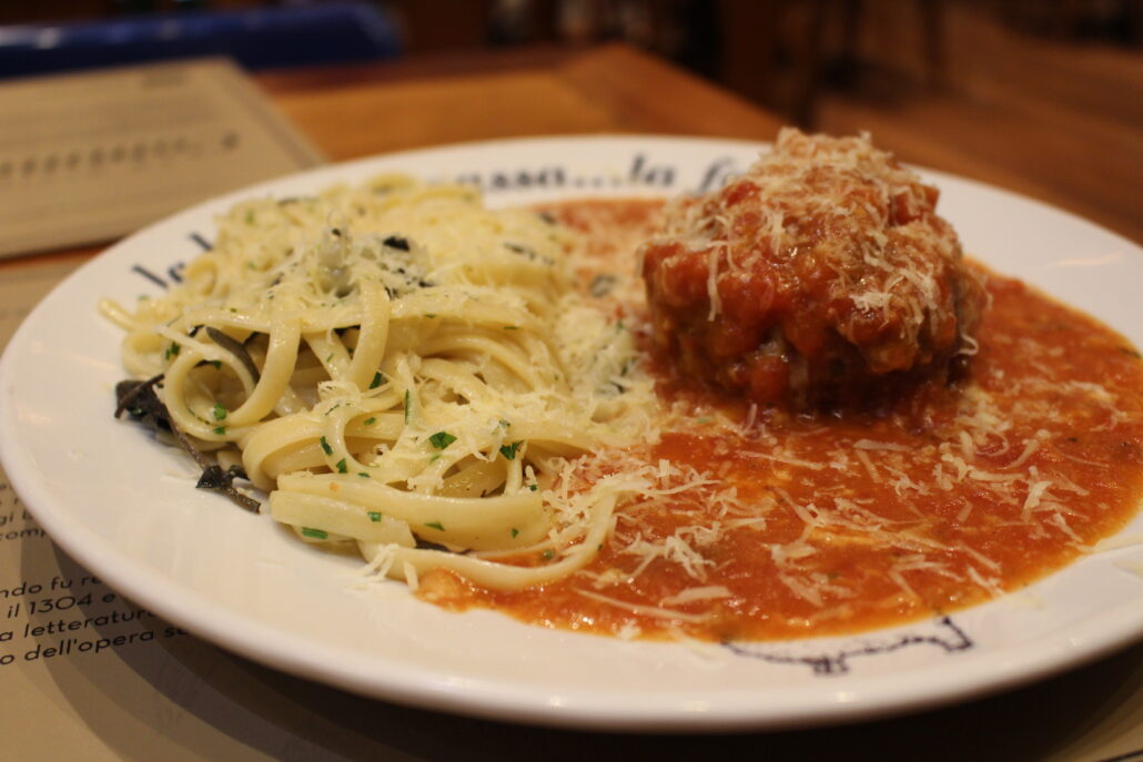 Nos principais, o nível sobe. O polpettone alla parmegiana é bem executado, com recheio generoso, molho equilibrado e acompanhamento que complementa sem roubar protagonismo. O nhoque com ragu de cordeiro também se destaca, com massa leve e molho encorpado, resultado de um preparo longo que traz profundidade de sabor.