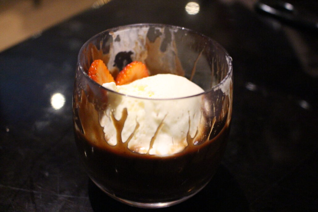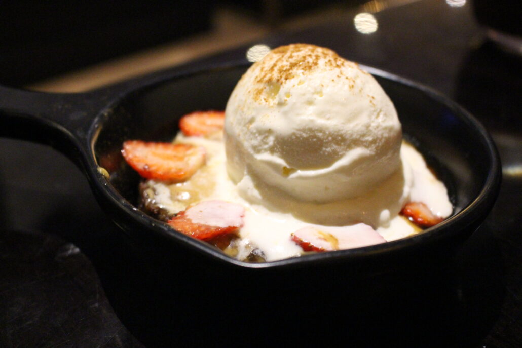 Base crocante, doce de leite, caramelo, morangos frescos, sorvete de baunilha e toque de canela