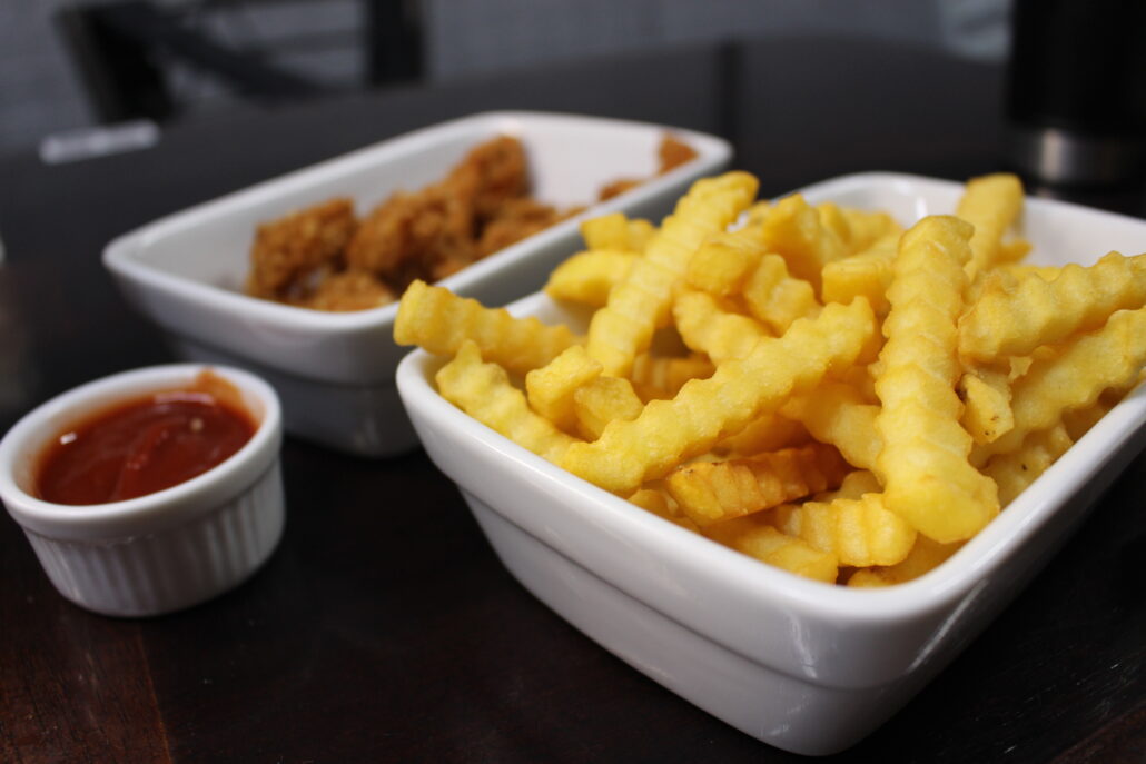 Meia porção – batata e isca de frango empanado (alho e cebola)