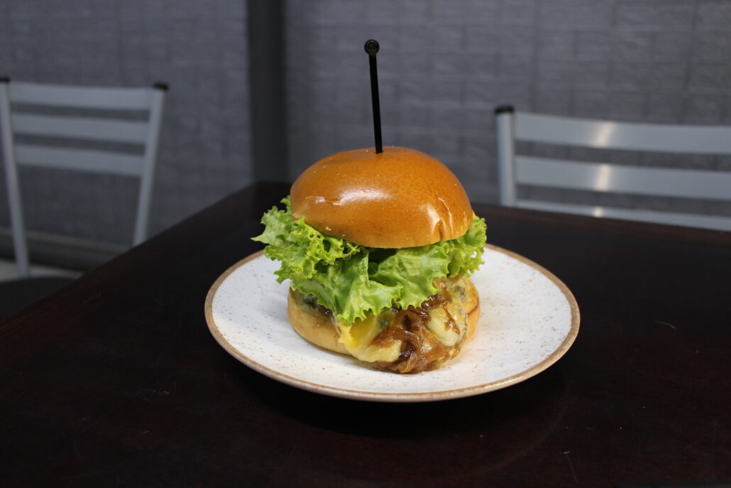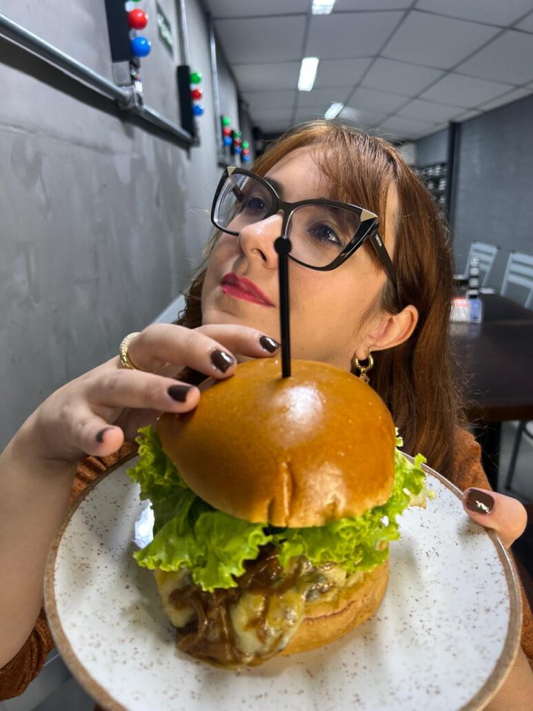 Hambúrguer, quatro queijos (gorgonzola, muçarela, prato e provolone), alface, tomate, maionese, rúcula e cebola caramelizada no pão brioche
