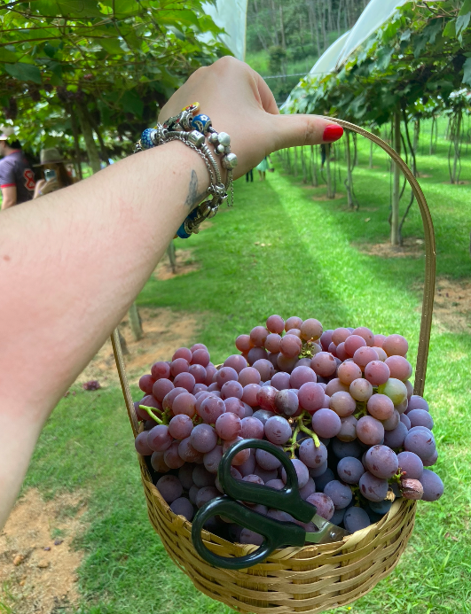 Após o café, os participantes são levados de ônibus até o topo do complexo, onde acontece a colheita. Cada pessoa recebe cestos e colhe as uvas diretamente do parreiral. É leve, divertido e muito simbólico — eu mesma completei cinco cestos. As uvas colhidas seguem para o lagar, onde acontece a pisa.