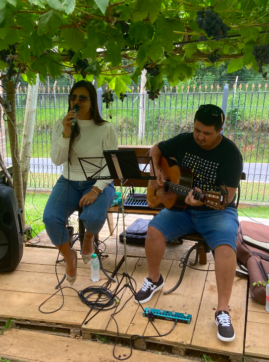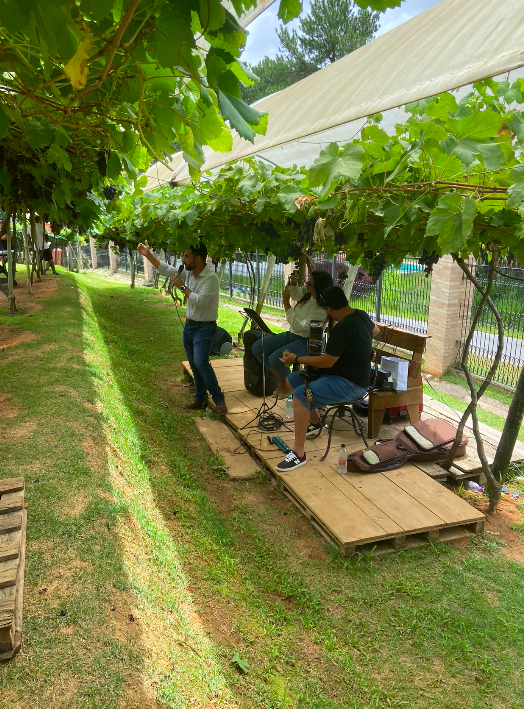 Antes da pisa, descemos para um espaço lindíssimo, com música ao vivo sob parreiras de uva. Ali, o enólogo Giovane explica, de forma simples e envolvente, as diferenças entre uvas Niágara, uvas finas europeias, vinhos de mesa, vinhos de guarda e todo o processo de produção. Você aprende sem nem perceber.