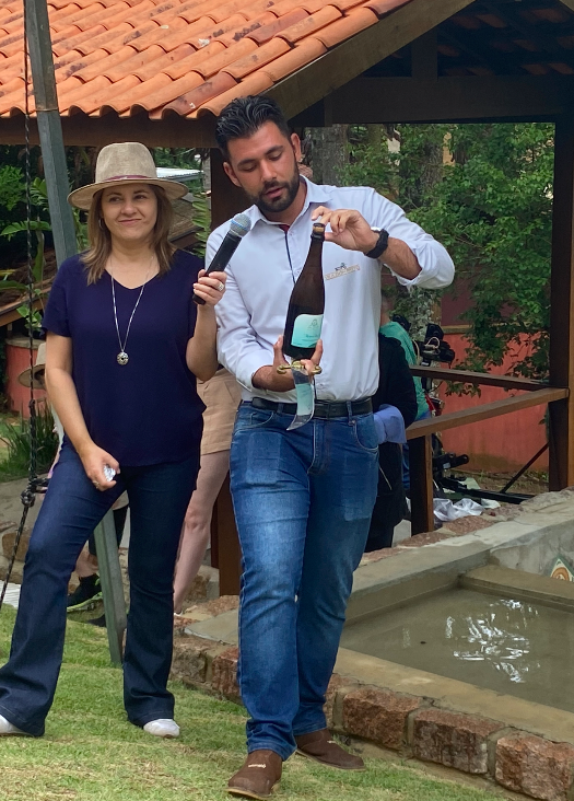 A sabrage é explicada em detalhes, com direito à história de Napoleão Bonaparte. O enólogo abre a garrafa e convida participantes para repetir o ritual.