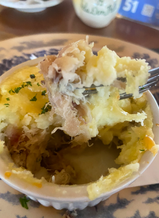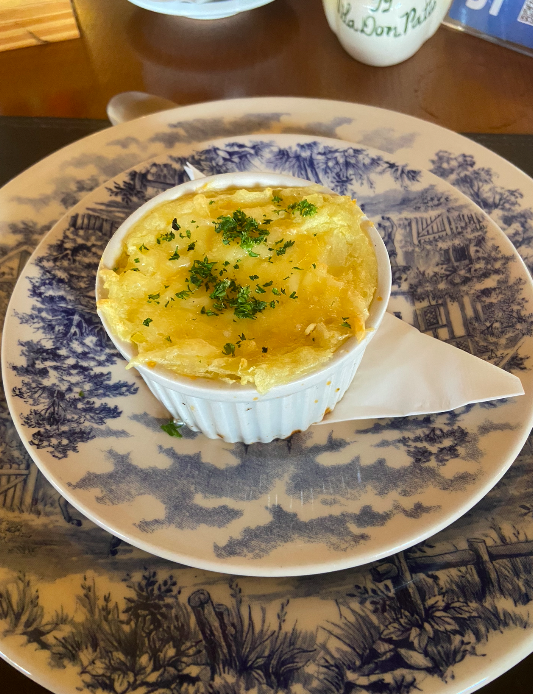Os pratos principais são um espetáculo à parte. O Bacalhau da Saudade, criação da casa, merece aplausos: extremamente bem temperado, no ponto certo de sal — nada excessivo — mostrando respeito ao ingrediente. O escondidinho de bacalhau segue a mesma linha: cremoso, bem estruturado, saboroso e perfeitamente equilibrado, sem aquele excesso de sal que infelizmente ainda vemos em muitos lugares.