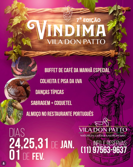 Se você procura uma experiência que vá muito além de comer bem, anota essa dica agora. A Vindima da Vila Don Patto acontece em datas específicas e limitadas, e é daquelas vivências que ficam guardadas na memória. Janeiro é o mês da colheita da uva, e participar desse ritual transforma completamente a forma como você passa a enxergar o vinho, a gastronomia e o tempo.