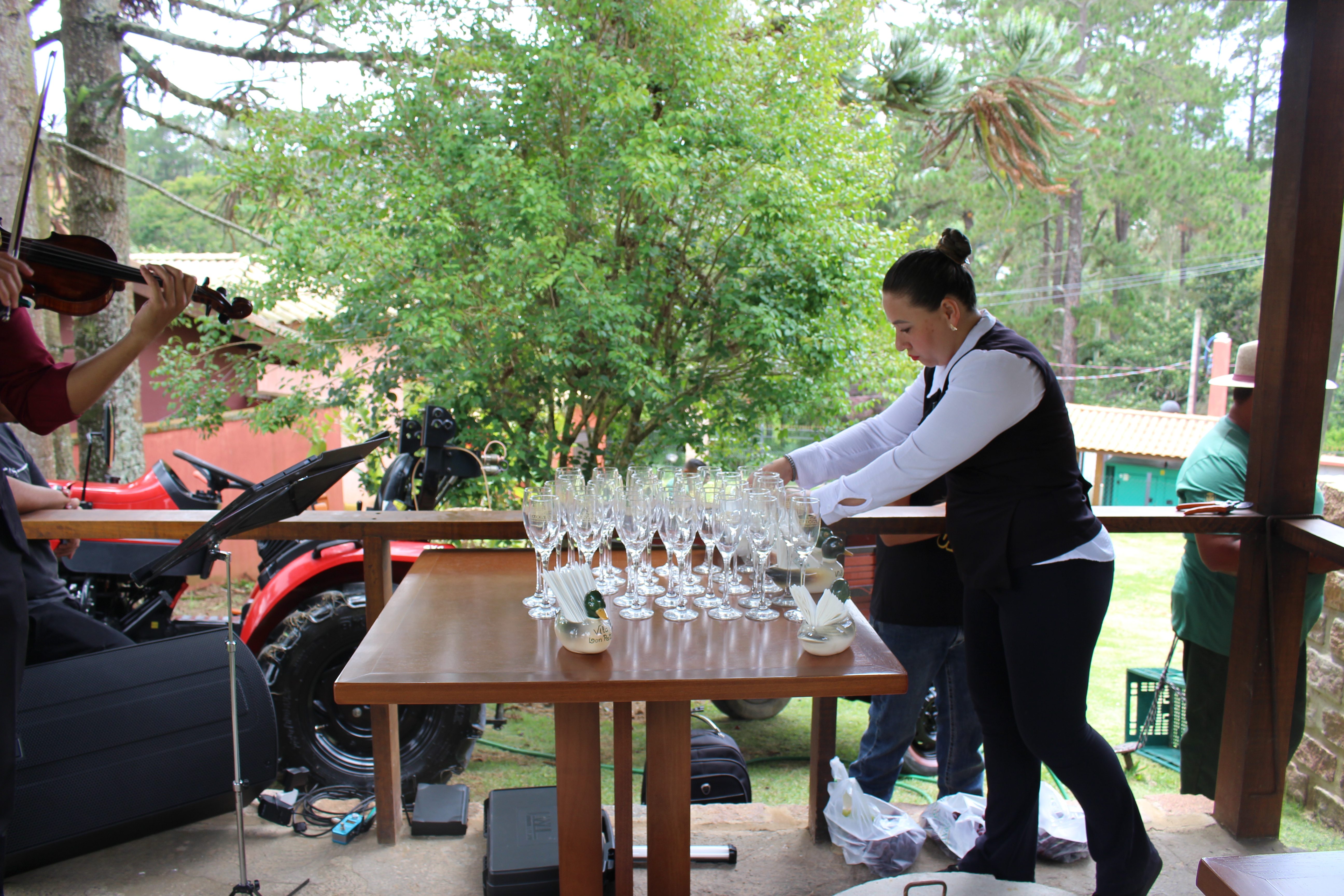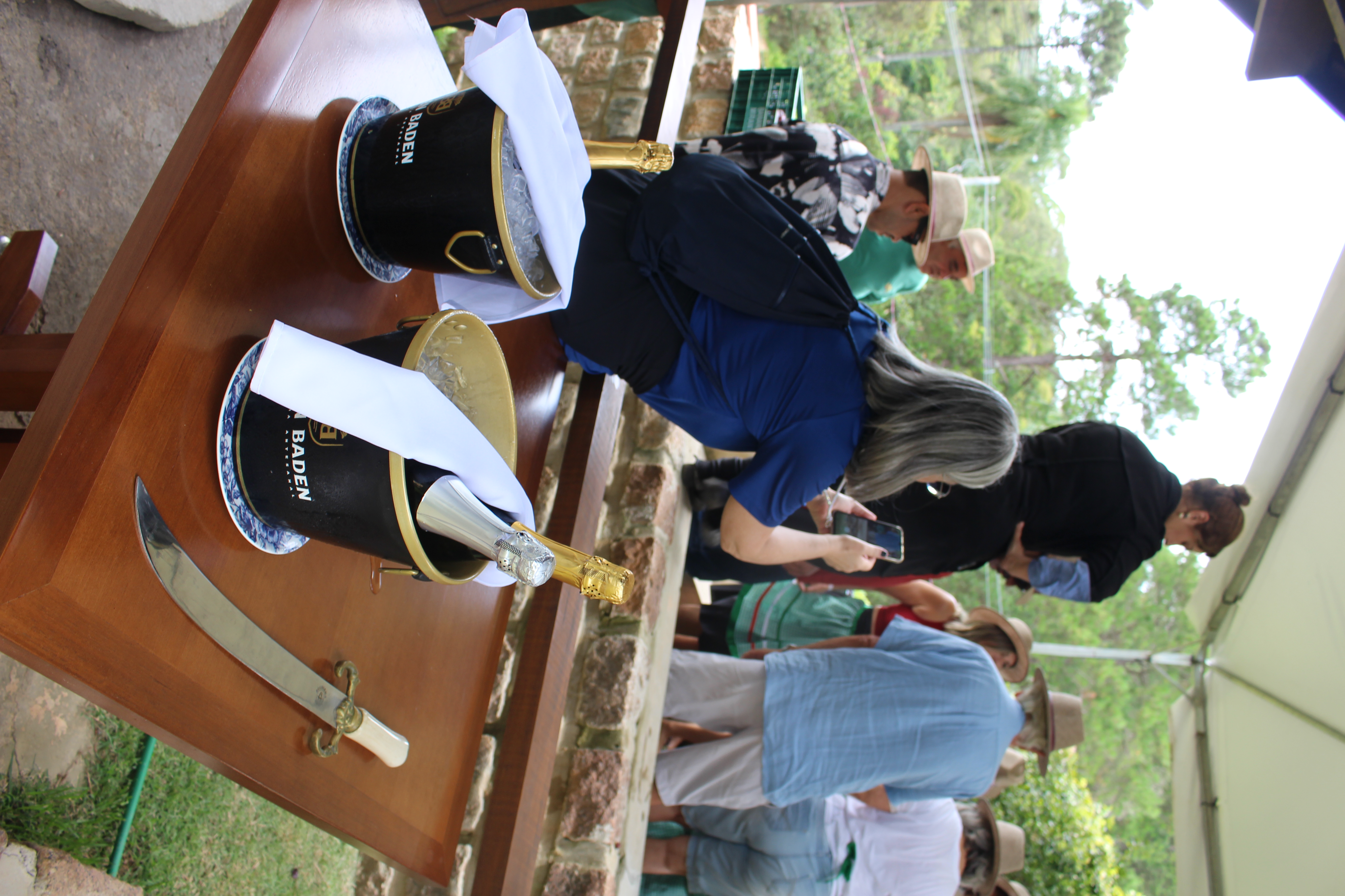 Depois, vem o brinde com espumante, acompanhado de um coquetel pós-sabragem — e ainda ganhamos taças de vidro como lembrança e o chapéu. Um cuidado que faz toda a diferença.