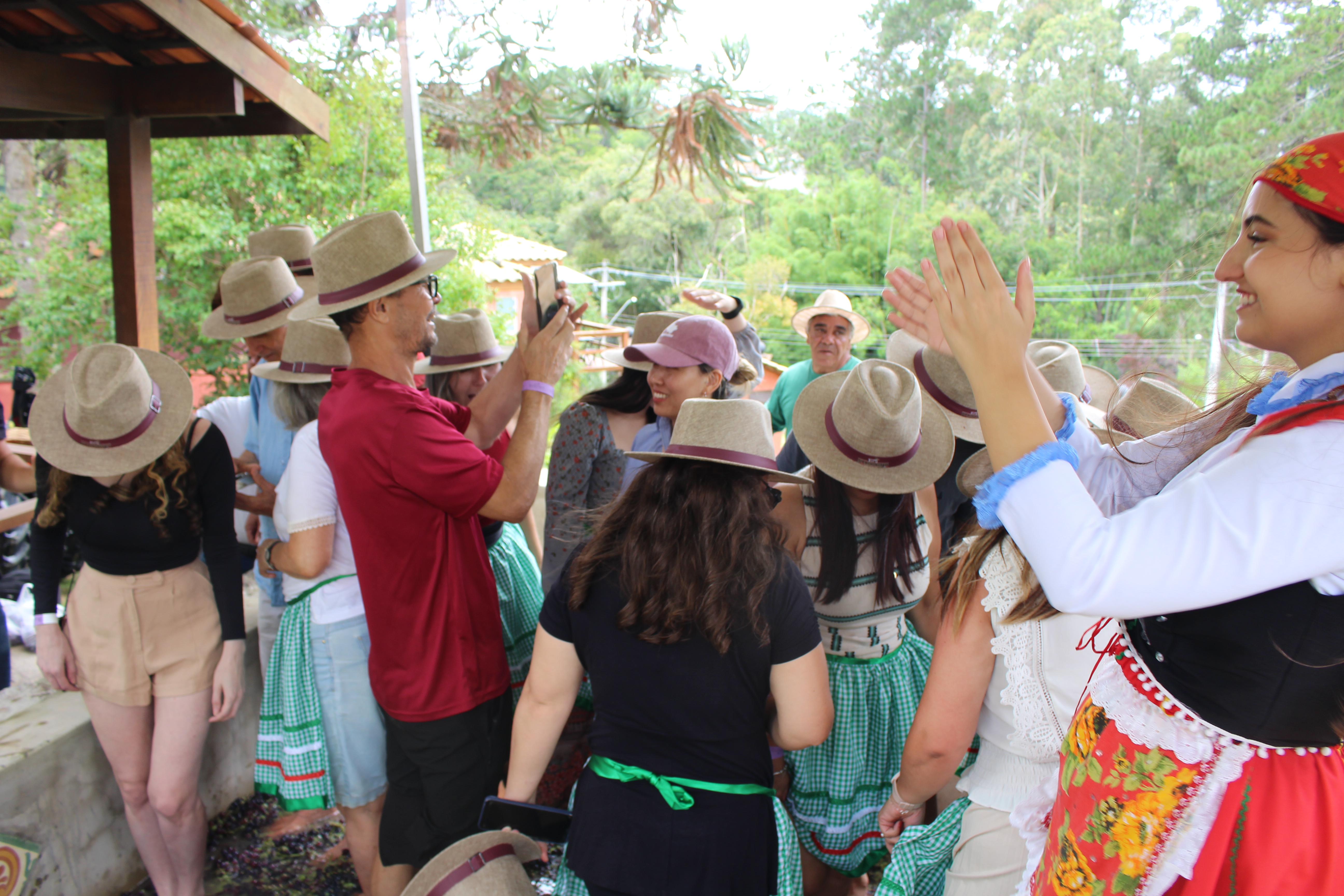 Chega o momento mais aguardado: a pisa da uva. As mulheres recebem aventais para não sujar a roupa, todos entram no clima, pisam, dançam, riem. É alegria pura, coletiva, espontânea.