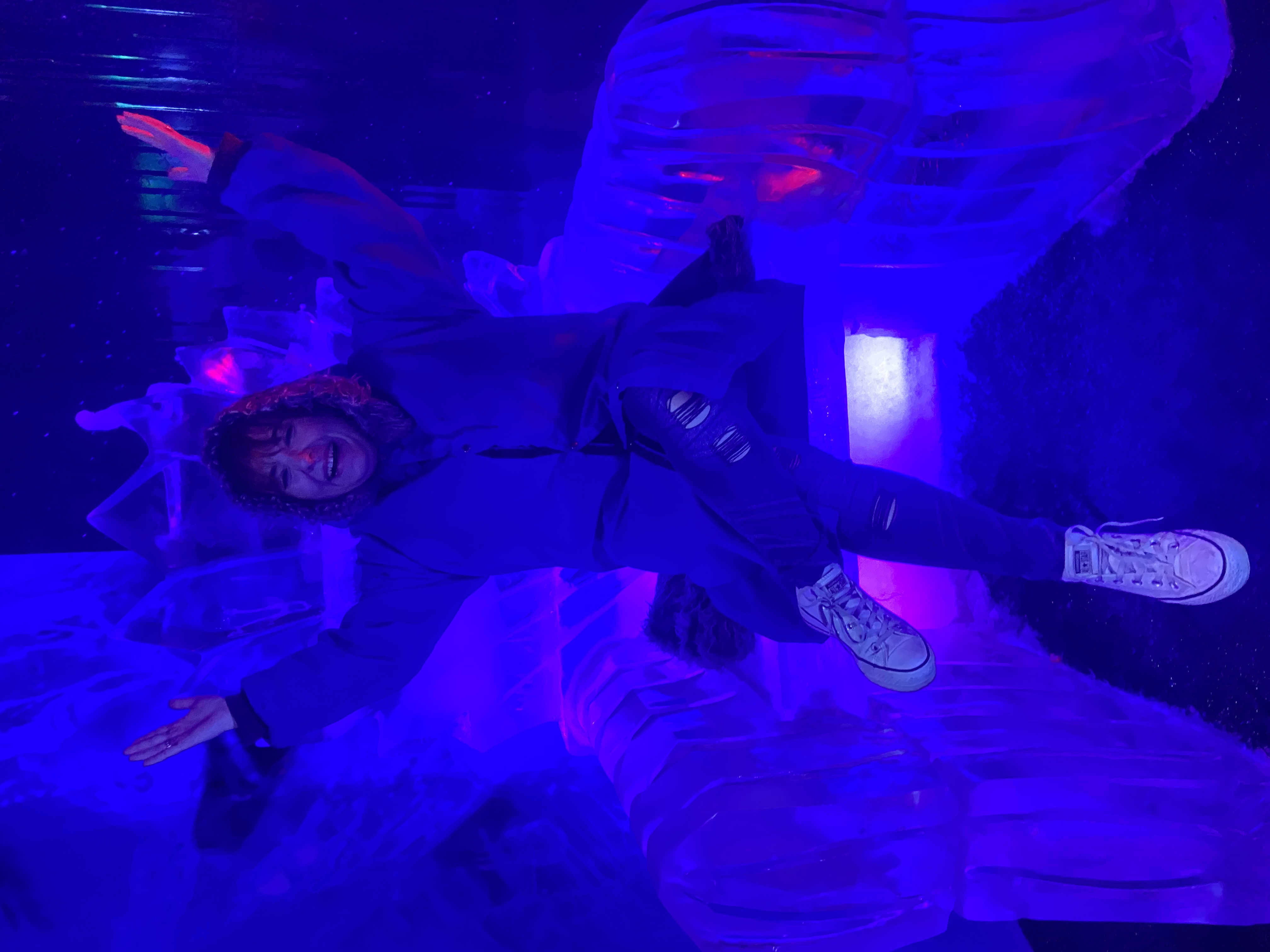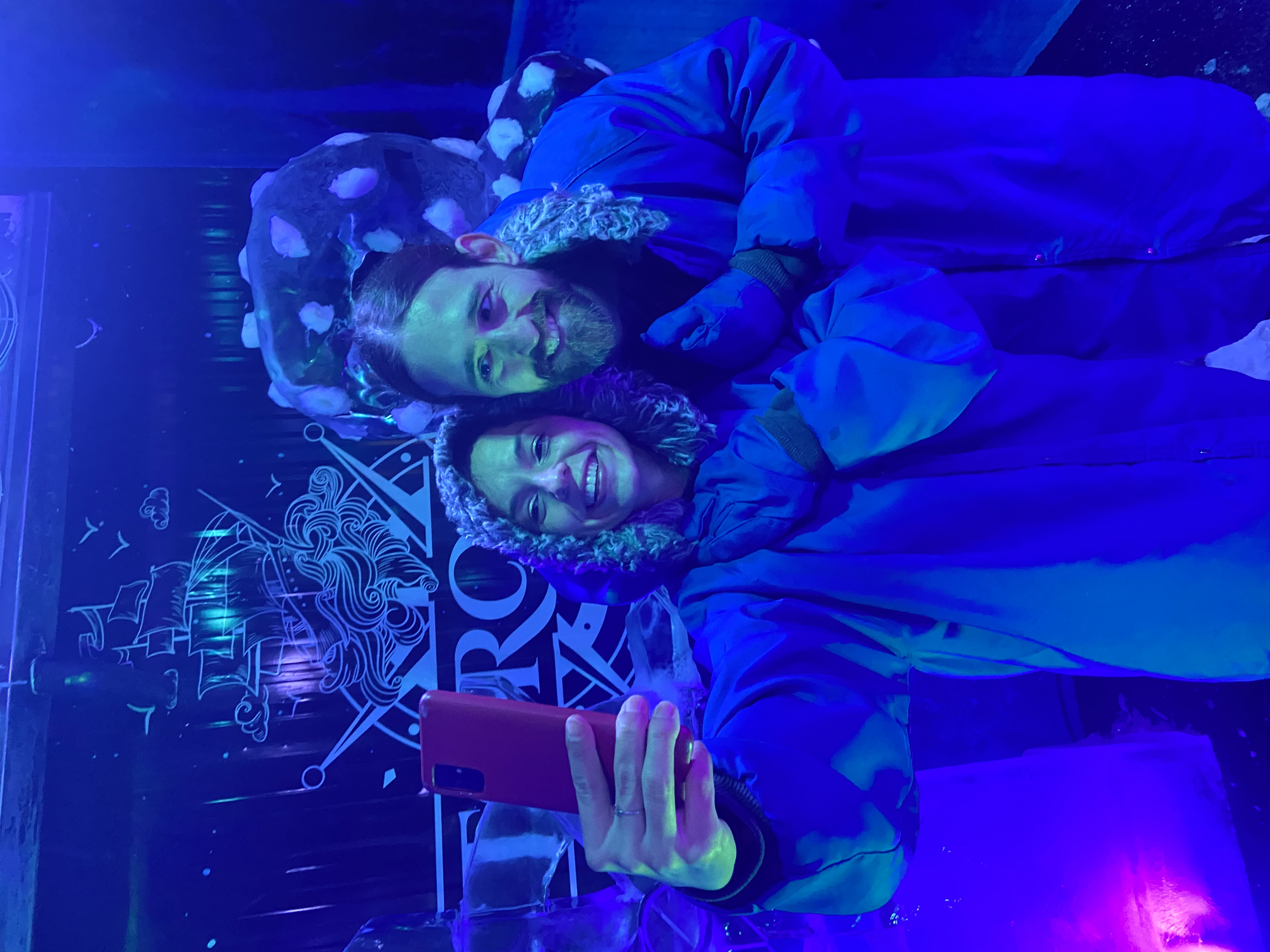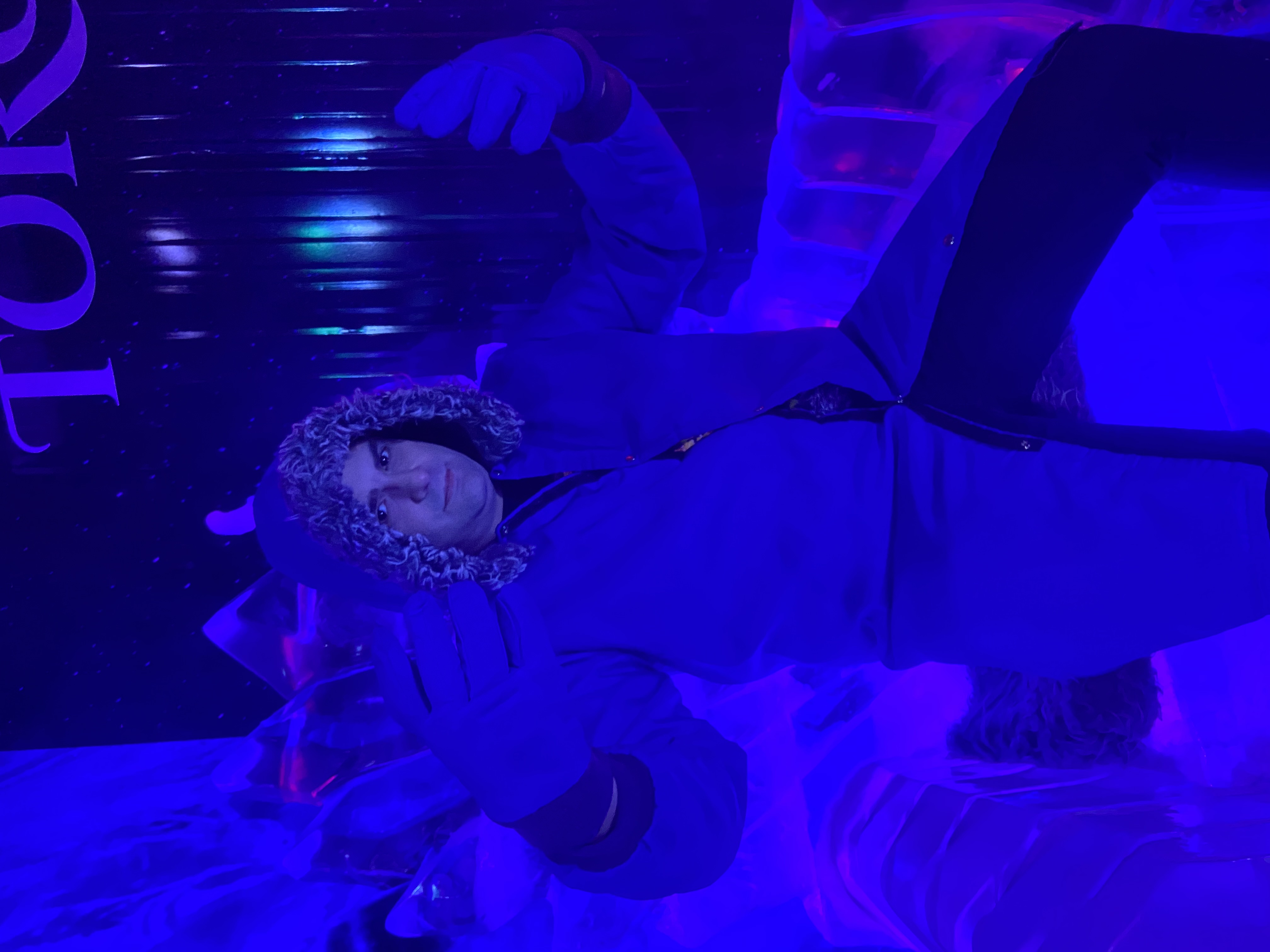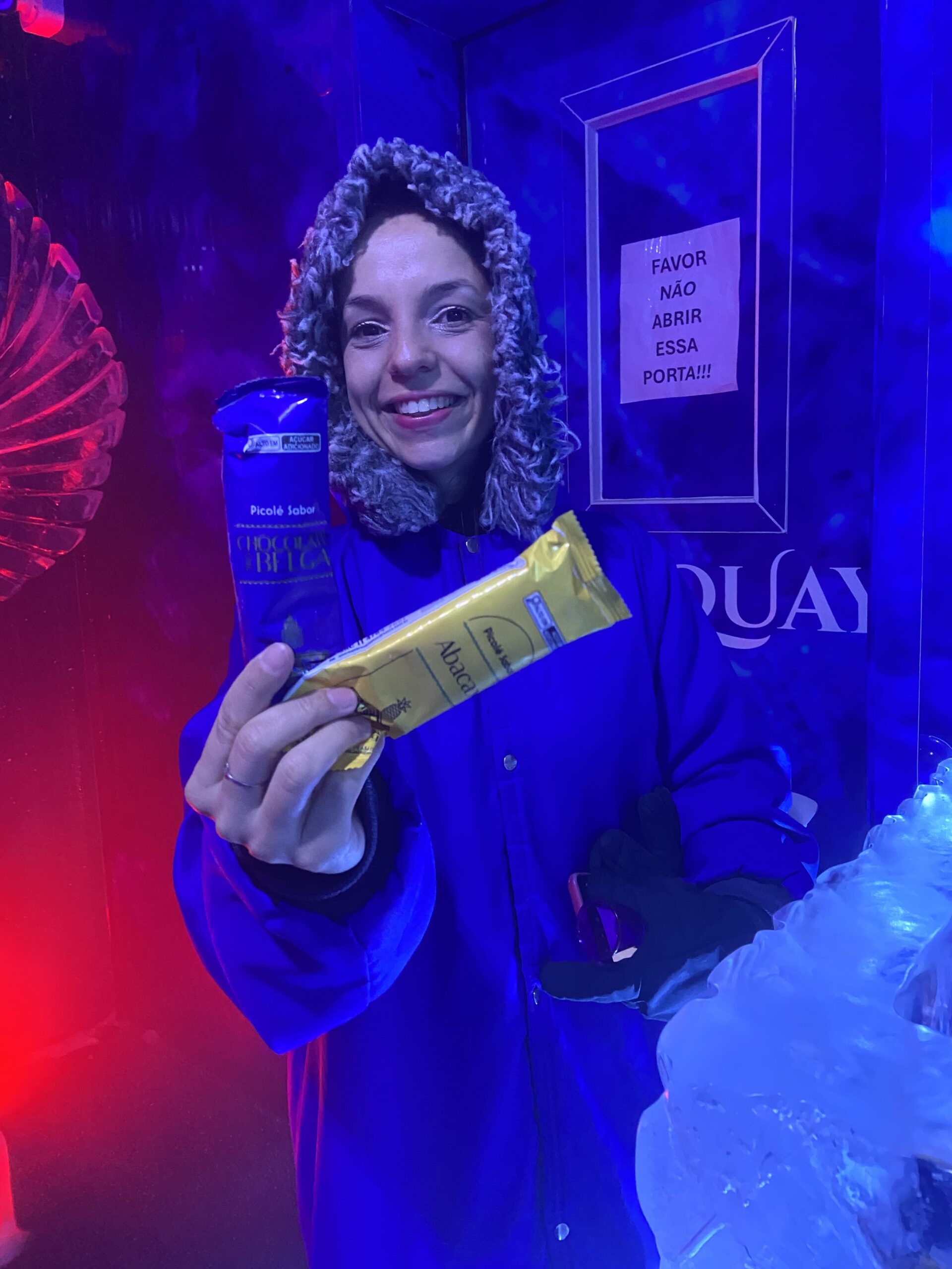 Ao entrar, você recebe casaco e luvas térmicas para suportar o frio. O ambiente é encantador, com iluminação azulada e taças de gelo — perfeito para fotos e vídeos incríveis.
