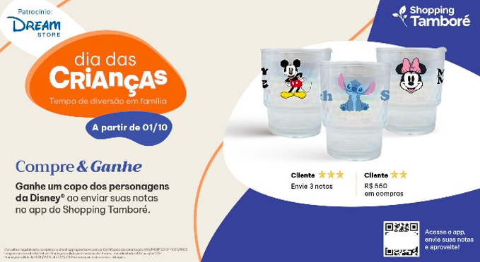Até o dia 12 de outubro, os participantes poderão aproveitar a campanha Compre & Ganhe. Ao cadastrar suas notas fiscais no aplicativo do shopping, os clientes terão direito a um copo colecionável com personagens Disney, em parceria com a Dream Store. São três modelos disponíveis, e a mecânica varia de acordo com a categoria: clientes duas estrelas ganham o brinde a partir de R$550 em compras, enquanto clientes três estrelas recebem mediante o cadastro de duas notas fiscais.