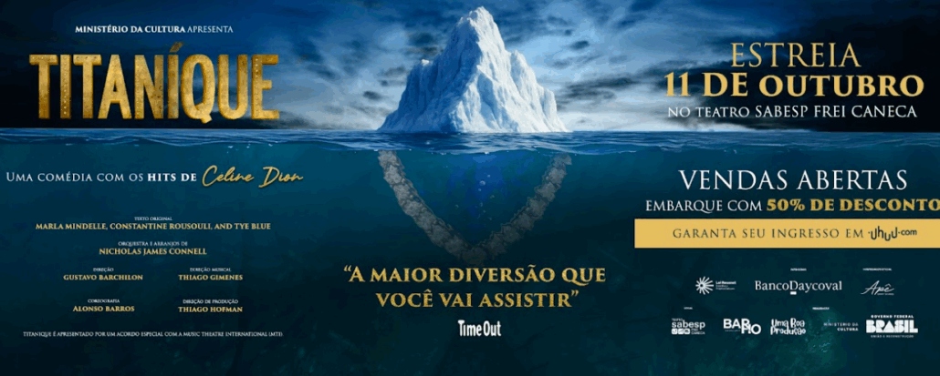 Vendas pela internet: (https://uhuu.com/evento/sp/sao-paulo/titanique-uma-comedia-com-os-hits-de-celine-dion-14940)